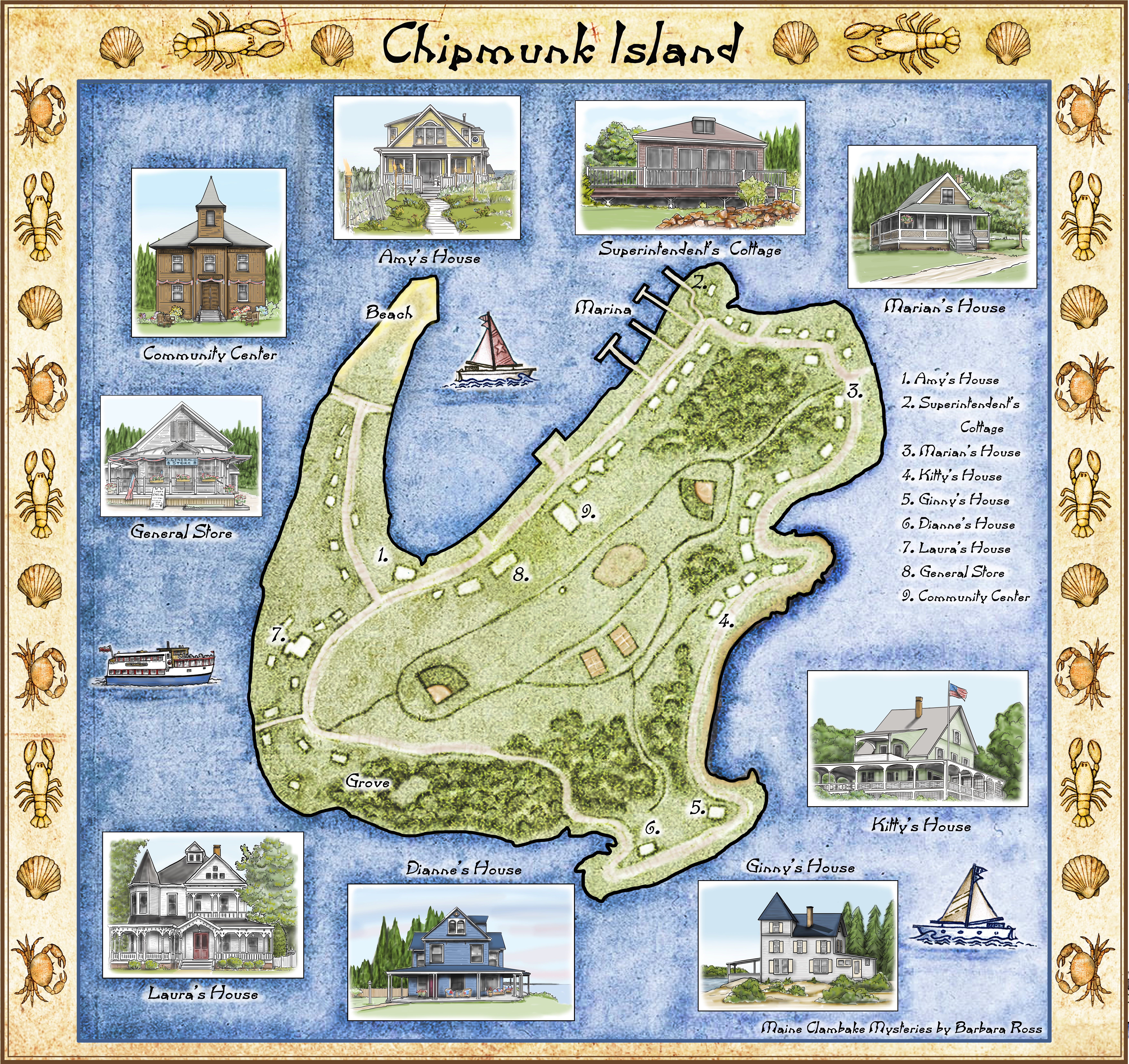 This map of Chipmunk Island is intended as a companion to the eleventh book in the Maine Clambake Mystery series, Hidden Beneath.